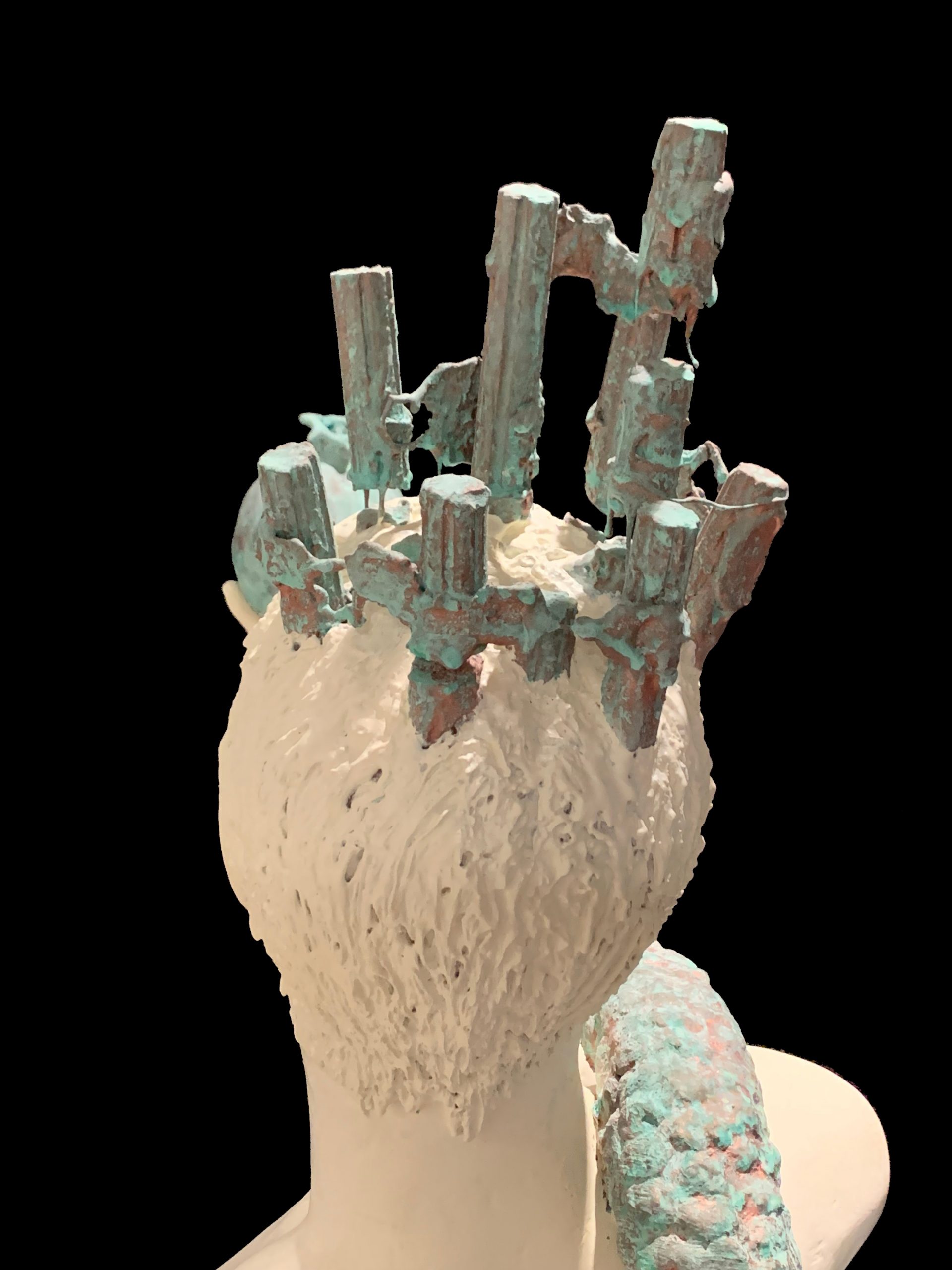 Materials: Mixed media (plaster, metal, patinated surfaces, copper, epoxy resin)