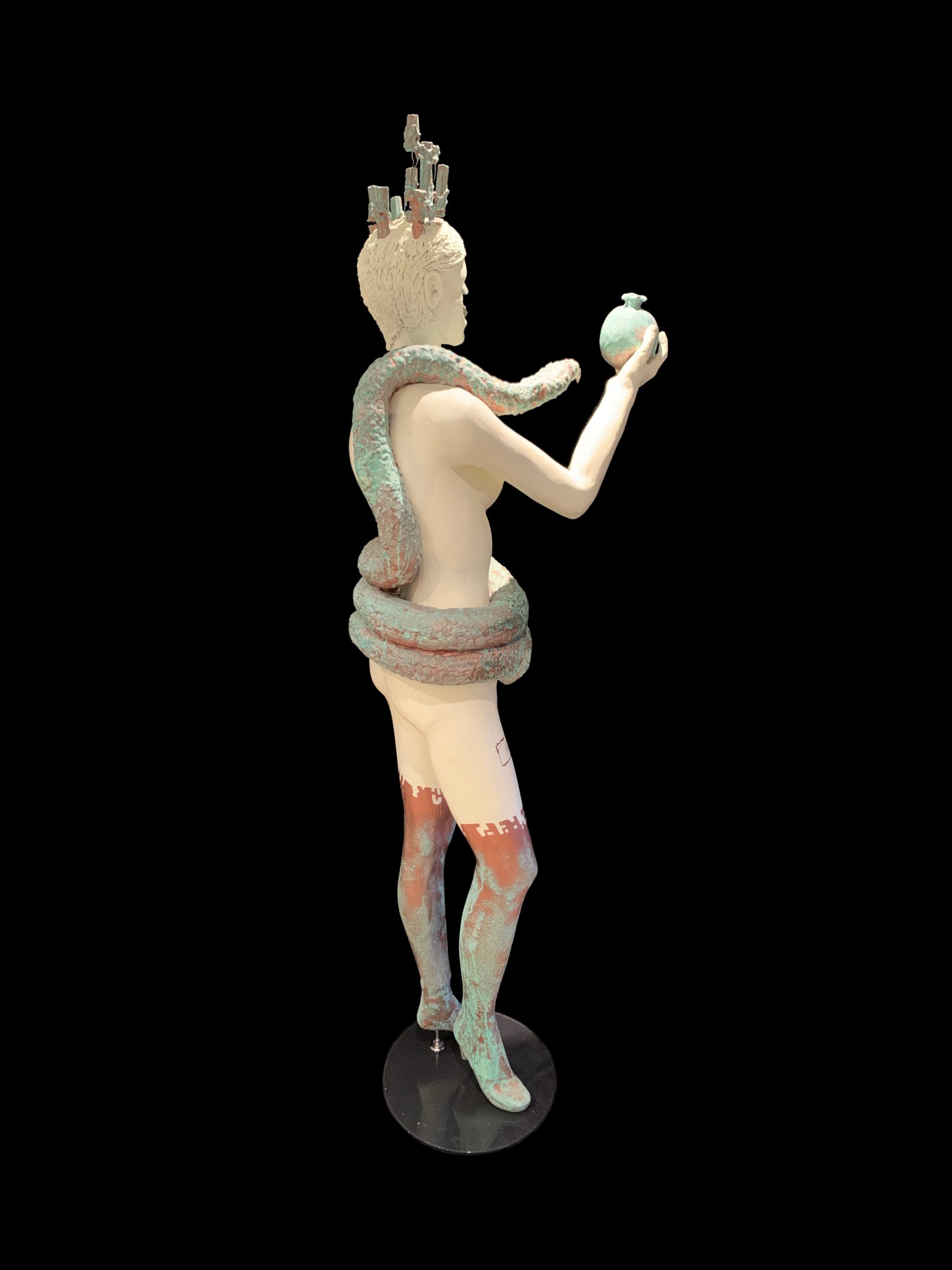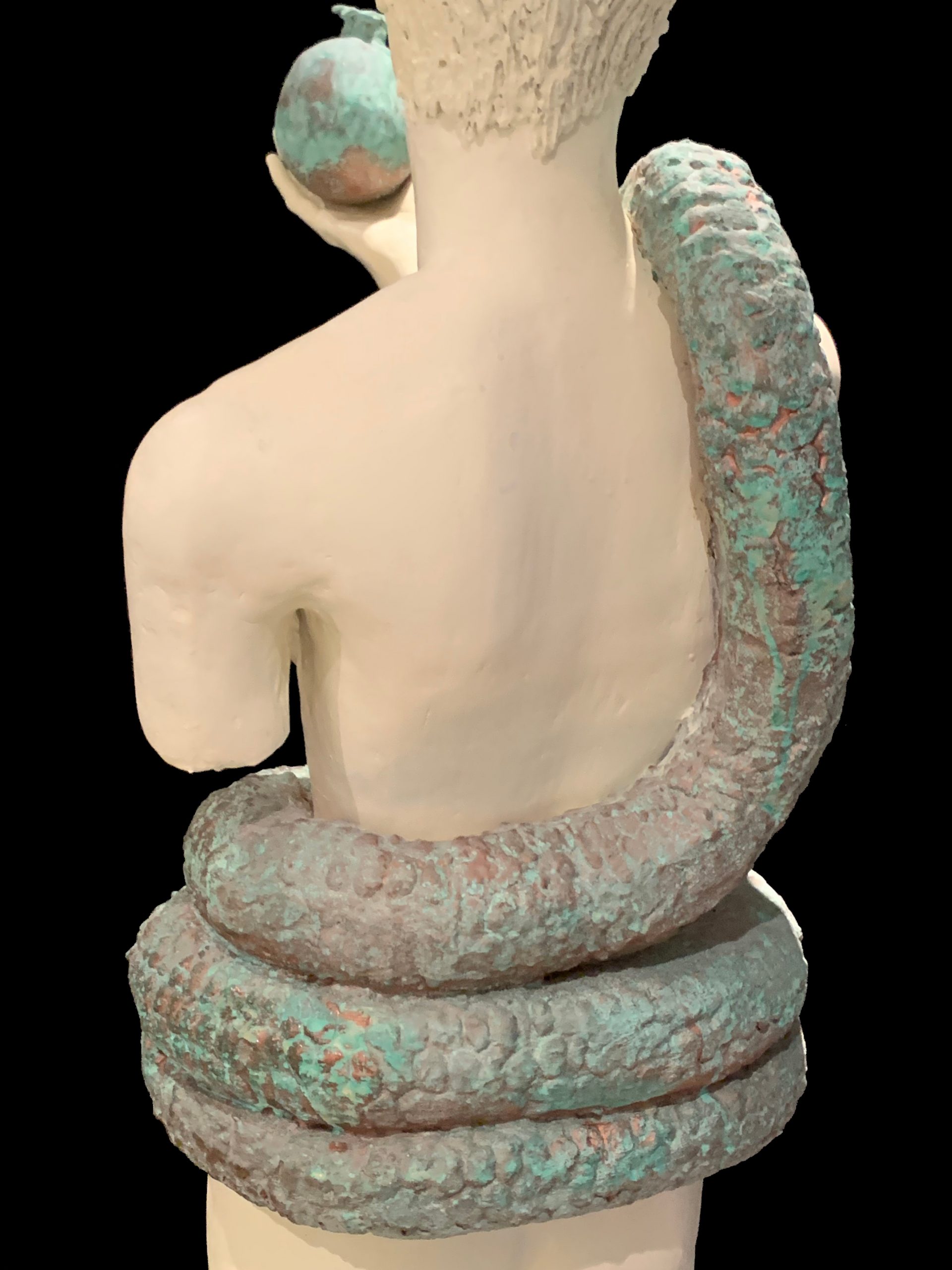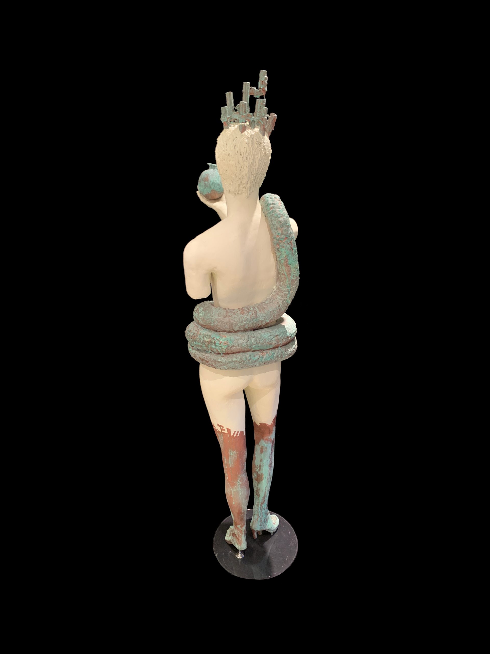 Coiled by a monumental serpent and crowned by crumbling fragments of ruins, Eve embodies both the origin of life and the quiet beginning of its decay.