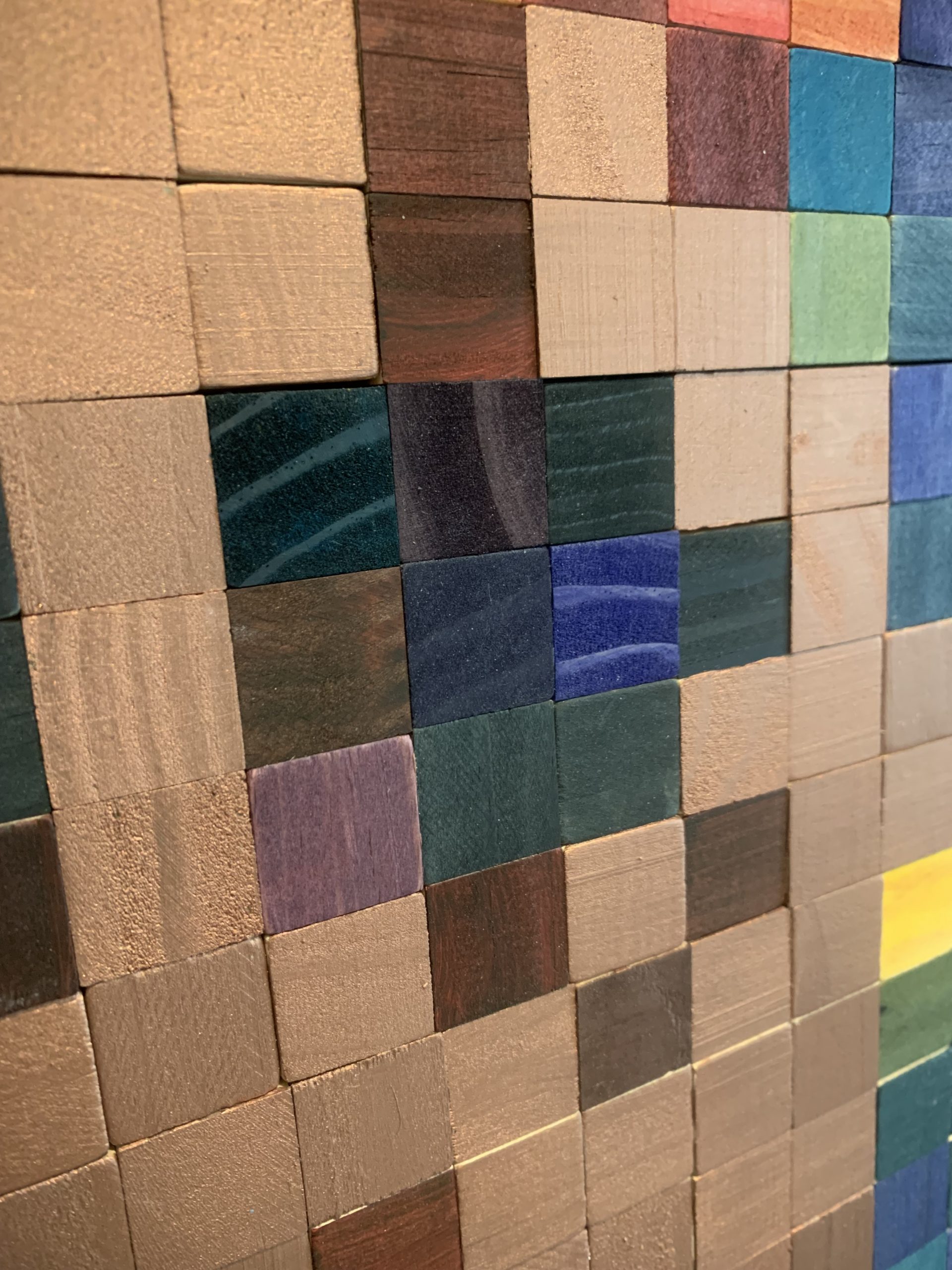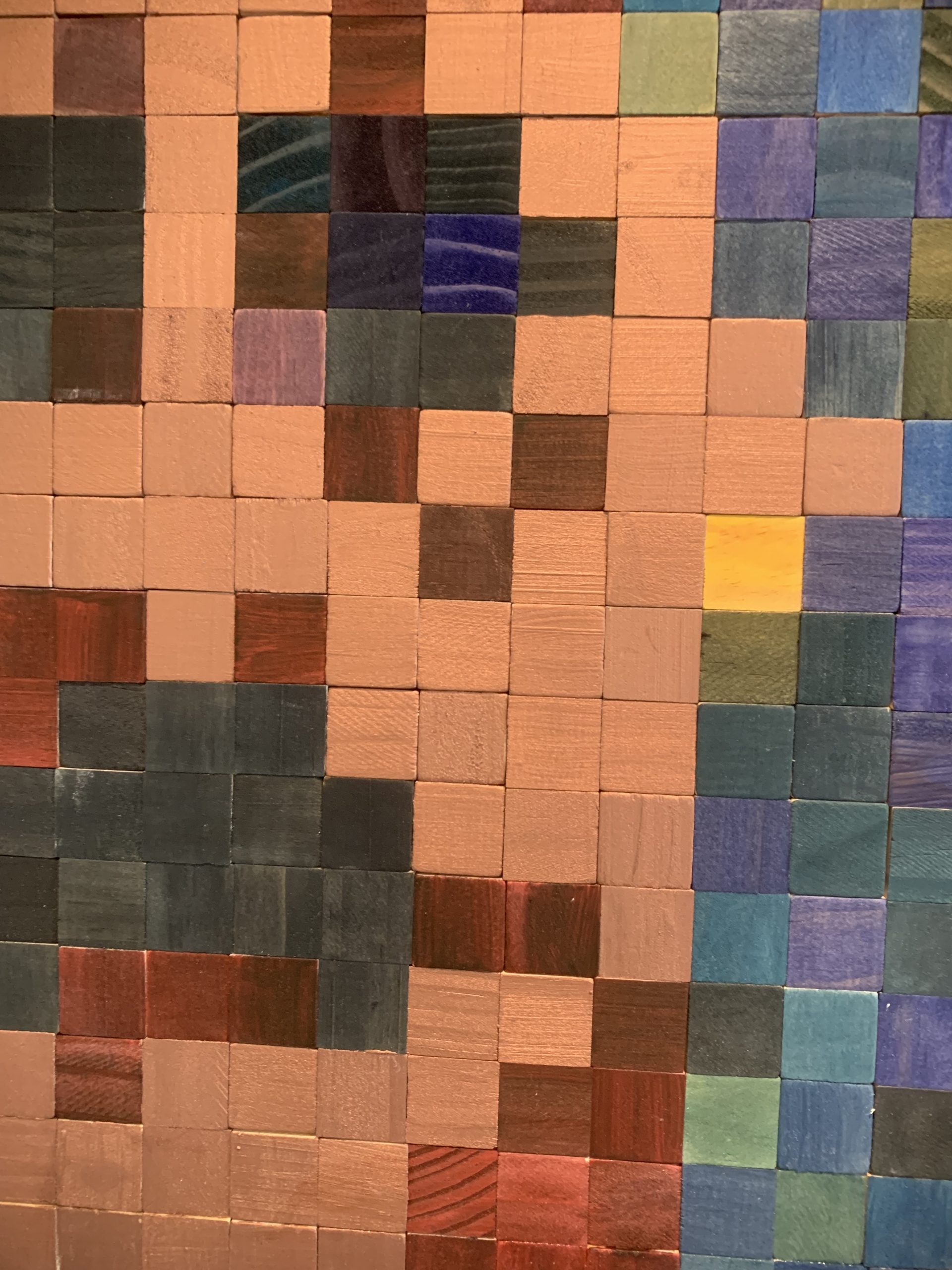 A fragment of a face is created from 425 individually colored wooden cubes – recognizable and yet distant.