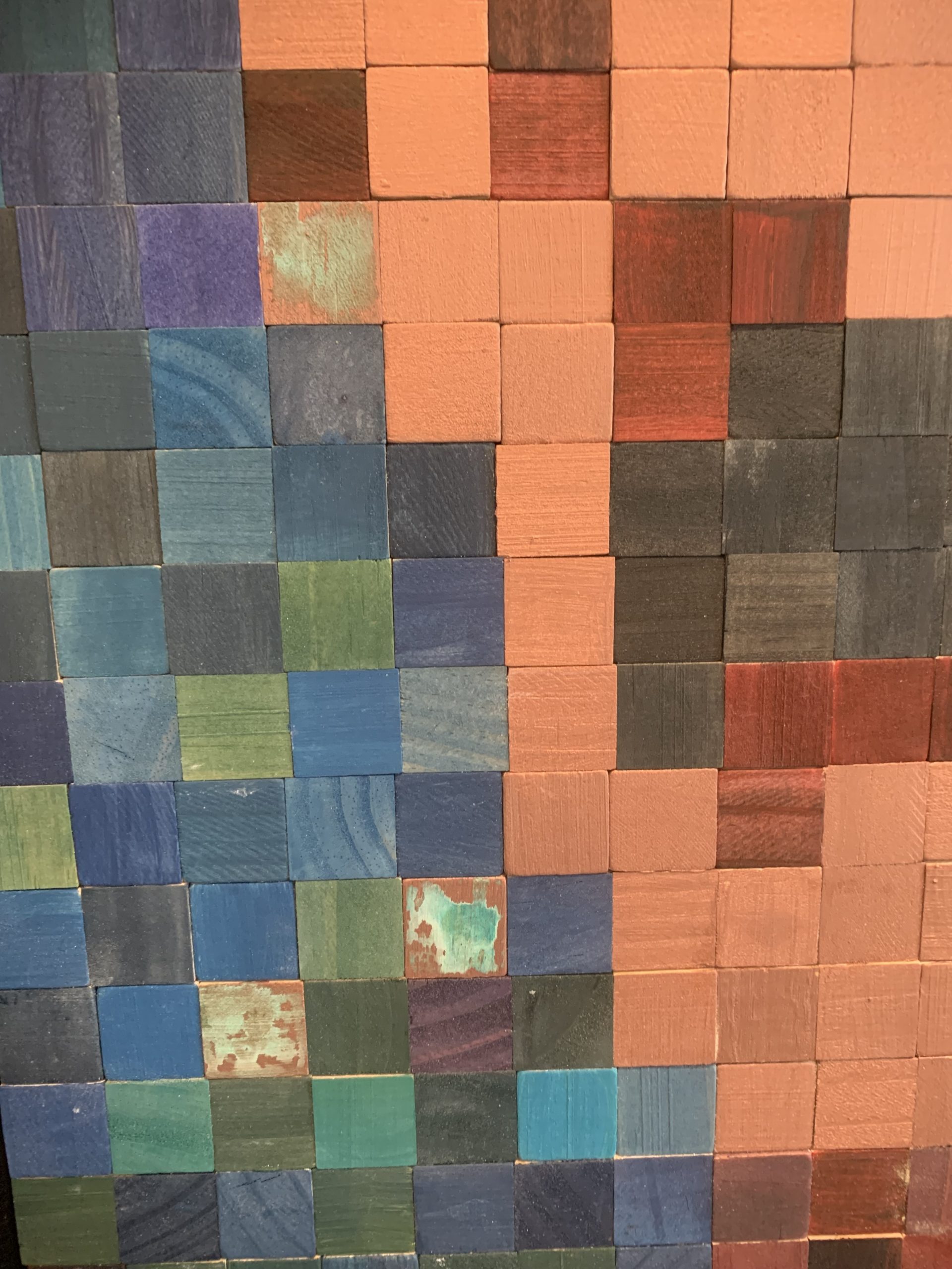 Materials: Acrylic on wooden cubes, copper paint, patina